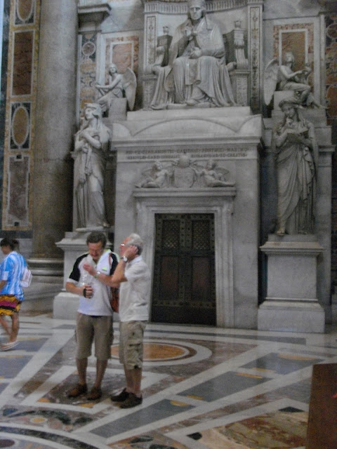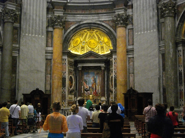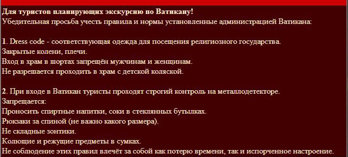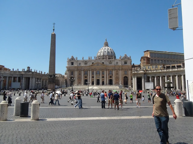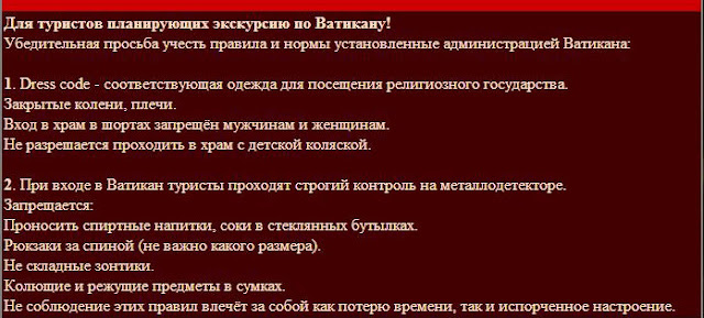 Проехали до станции Ottaviano-San Pietro. Вышли на поверхность города и направились в государство-город в пределах столицы Италии — Рима. Вот и мы пришли, отстояли огромную очередь и в итоге наших женщин развернули назад, из-за несоблюдения дресс кода. Когда шли к собору святого Петра, видели продажу на улице, ситцевых платьев. Вернулись и купили платья. Теперь нас всех пропустили в собор святого Петра. Ура!