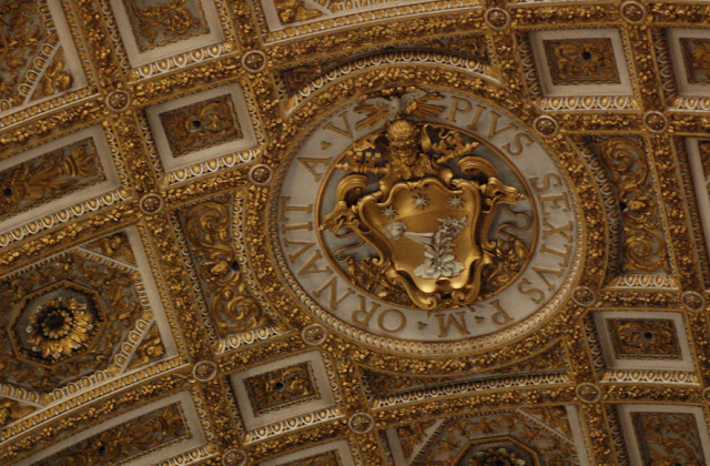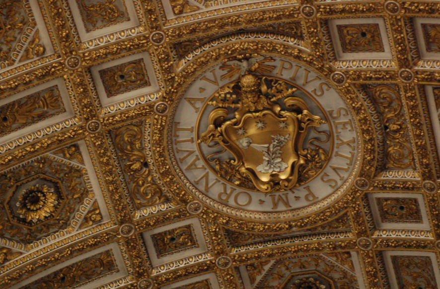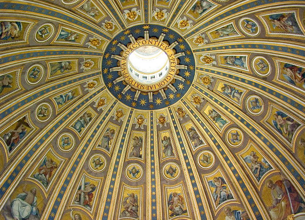 Громадный купол собора Святого Петра взмывает вверх словно поднятое ветром легкое полотнище. Его диаметр составляет 42 метра, и в Риме его называют «cupollone» («куполище»). По фризу купола и далее по фризу всей церкви идет мозаичная надпись по-гречески и по-латыни со словами Христа: «Ты — Петр, и на сем камне Я создам Церковь Мою, и не одолеют ее врата адовы; И дам тебе ключи Царствия Небесного; и что свяжешь на земле, то будет связано на небесах; и что разрешишь на земле, то будет разрешено на небесах».
