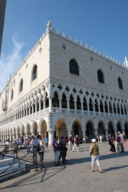 Дворец Дожей по-итальянски звучит как Палаццо Дукале (Palazzo Ducale). Строительство этой достопримечательности Венеции было начато в IX веке, а современный вид здание приобрело к концу XIII — началу XIV веков. В архитектуре Дворца явно прослеживаются влияния трех стилей — готики, мавританского стиля и Ренессанса, а его сквозной нижний этаж поддерживает собой внушительный объем стены, что создает ложное ощущение хрупкости и легкости. На самом деле нижний этаж здания опирается на 36 массивных колонн. Галерея второго яруса представляет собой двойной ряд колонн, но уже тонких и высоких. Третий ярус — гладкая стена с ассиметричными окнами разной величины. Фасадную стену венчает фигурный зубчатый аттик. В центральных частях фасадов располагаются балконы, с которых некогда дожи являлись народу.