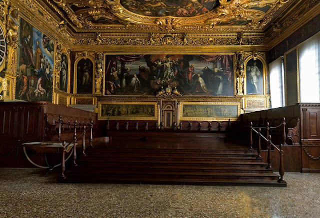 Много столетий Дворец Дожей служил резиденцией венецианского правительства. Также на протяжении веков дворец был местом заседаний советов республики, министерством, секретариатом и верховным судом. В верхнюю часть дворца ведет так называемая «Золотая лестница», по которой дожи поднимались в жилые помещения. Там же, в верхних этажах под крышей Дворца Дожей находится Зал Большого Совета — самое большое помещение в мире, потолок которого не держит ни одна опора. Отделка этого помещения XIV–XVI веков была утрачена во время пожара, а новое убранство появилось только в 1585 году. Над оформлением Зала Большого Совета работали такие известные художники, как Веронезе, Тинторетто, Якопо Пальма, Франческо Бассано. Еще один зал — Зал для голосований — украшен целой вереницей из портретов практически всех венецианских дожей. В самой середине зала стоит большая триумфальная арка, возведенная в честь дожа Франческо Морозини, разбившего турок. Во Дворце есть еще один интересный зал — Зал Коллегии, стены которого украшают полотна Веронезе и Тинторетто. Оружейная палата Дворца дожей привлекает туристов богатым собранием боевого оружия.