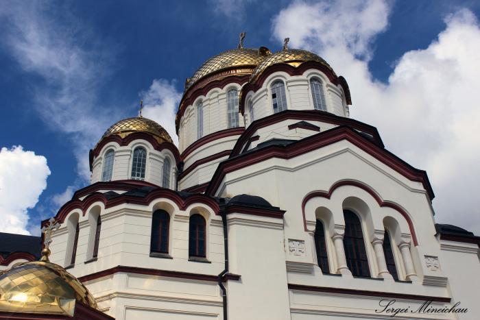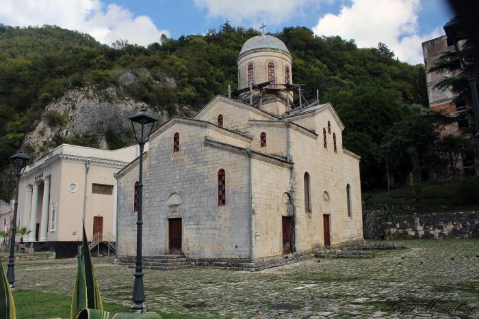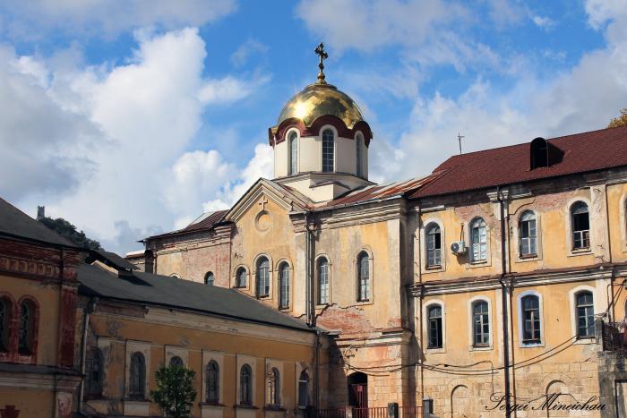 Обитель состоит из шести храмов, где в центре находится крупнейшее культовое сооружение Абхазии – пятикупольный Пантелеймоновский Собор, постоенный в нововизантийском стиле.