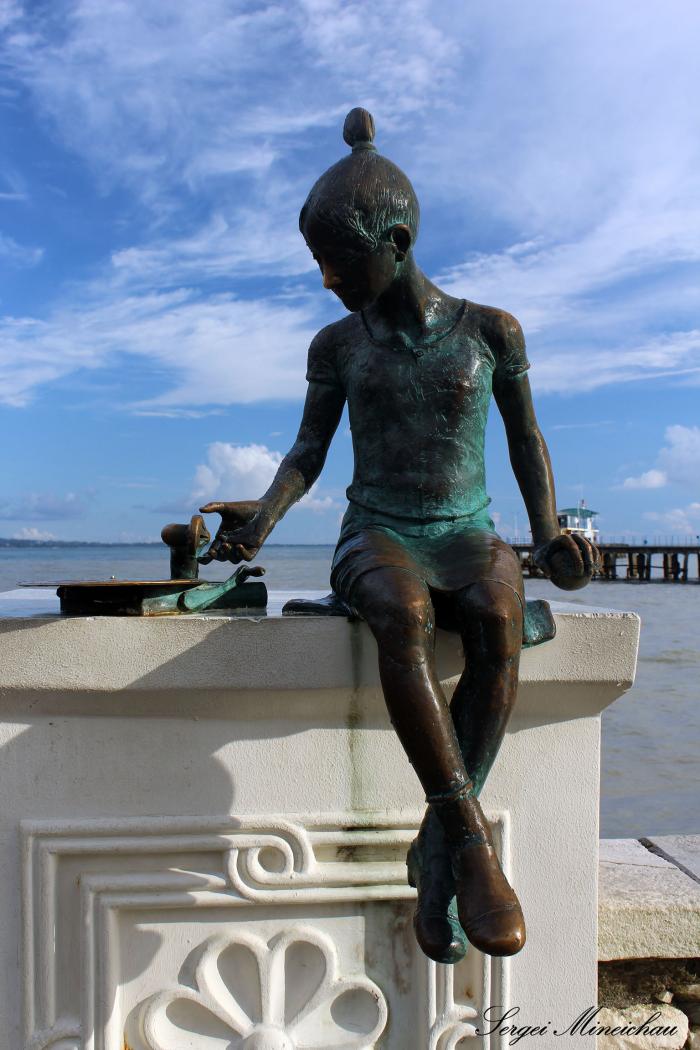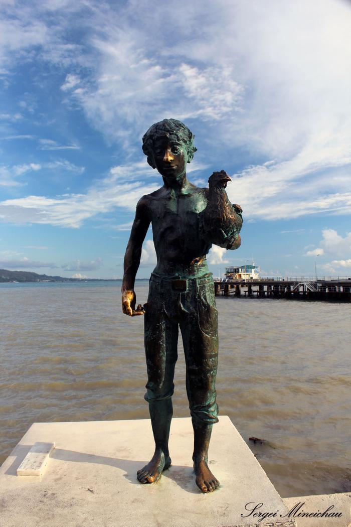 работы Архипа Лабахуа. Прохожие жмут руку мальчику Чику, который не смог зарезать белую курицу. Теперь друзья стоят вместе на тумбе около моря.