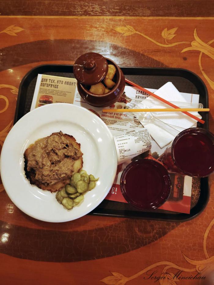 Мы заказали очень вкусные блюда: строганоф на дранике с огурцом, свинина по-смоленски с картофелем в горшочке и два клюквенного морса.