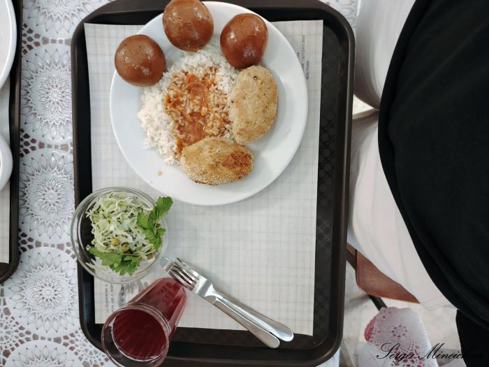 две котлеты с рисом, зелёный салат и клюквенный морс. Хочется заметить, что ностальгия не покинула нас и в этот раз, потому что в этих блюдах оказался «тот самый вкус». Обед обошёлся нам в 2355 RUB.