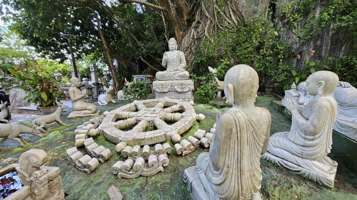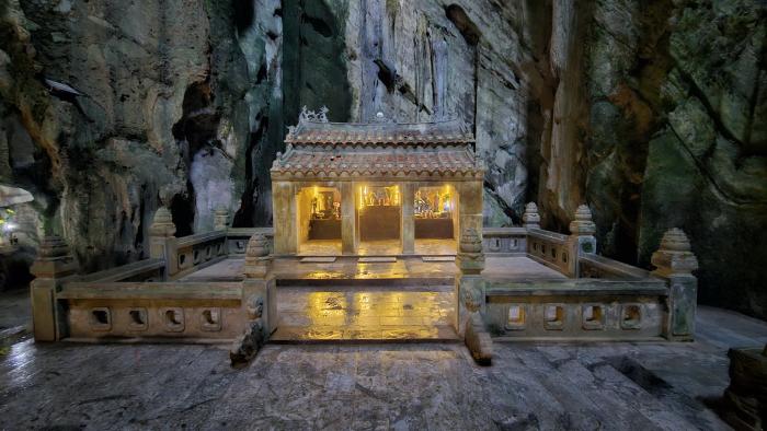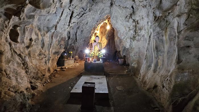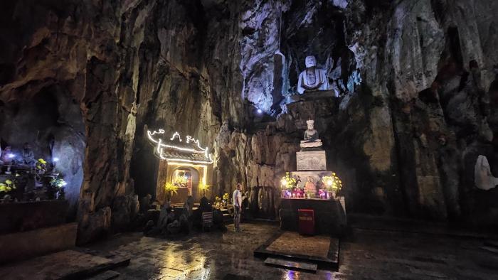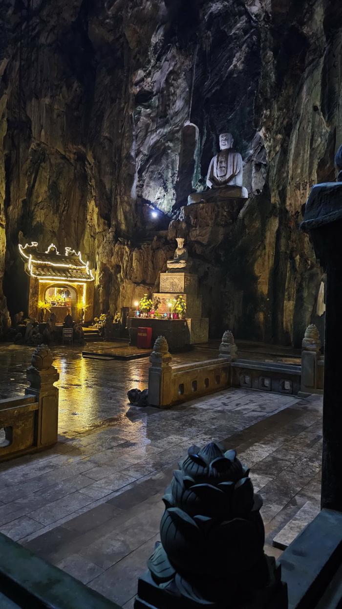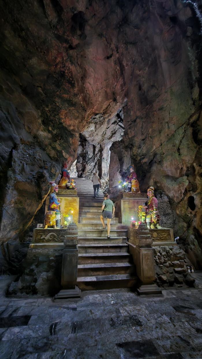 Особенно впечатляет большая пещера Хюэнь Кхонг (Huyen Khong Cave), на входе в которую установлены статуи четырёх стражей, адаптированных, по мнению историков, из индуистских богов. Форма пещеры напоминает огромный перевернутый купол или колокол; ее особенность – сквозные полости на потолке, благодаря которым в храме-пещере всегда есть свежий воздух и естественное освещение. Дневной свет падает сверху на трёхметровую деревянную статую Будды Шакьямуни. Просветленный сидит прямо напротив ступеней, ведущих в храм, и встречает посетителей своей блаженной улыбкой. В пещере царит удивительная мистическая атмосфера, как будто она – не буддистский храм, а портал в потусторонний мир. Кстати, само название Хюэнь Кхонг в переводе с вьетнамского означает «таинственная пустота», что довольно точно отражает духовную атмосферу святилища. Как везде в подобных местах, местные жители подогревают слухи о сверхлюдях и волшебных существах, обитавших здесь в свое время.
