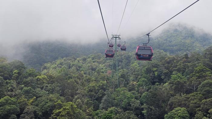 Строго говоря, система канатных дорог в Ba Na Hills включает не одну, а три линии, которые доставляют гостей в разные части парка. И эта канатная дорога в буквальном смысле возносит посетителей «над облаками». Поднимаясь на вершину горы, можно довольно долго наслаждаться потрясающими видами джунглей, гор и водопадов. В ясную погоду из кабинки канатной дороги виден практически весь Дананг. Но потом кабина поднимается выше, попадает в облака и вокруг становится довольно темно…