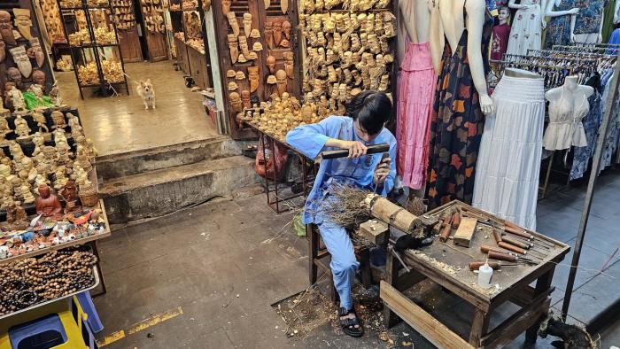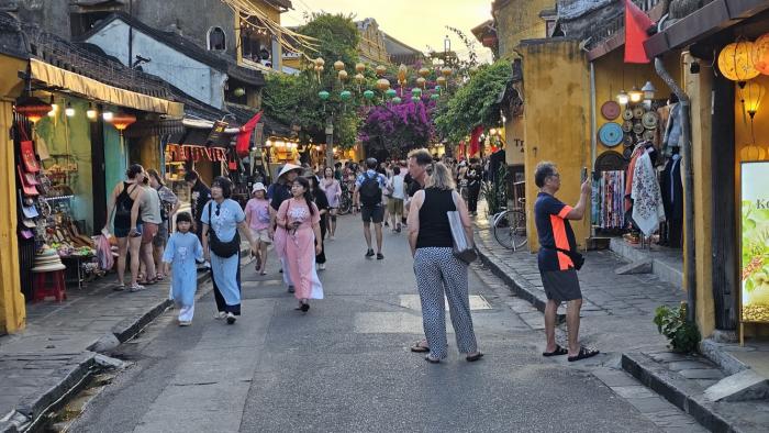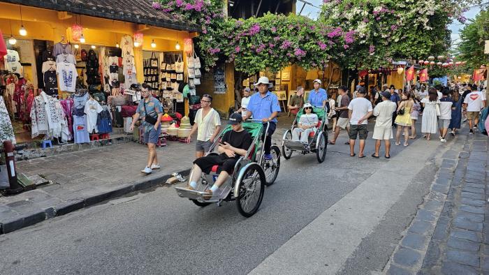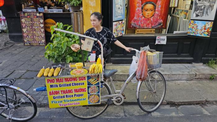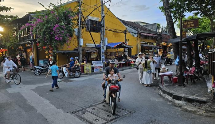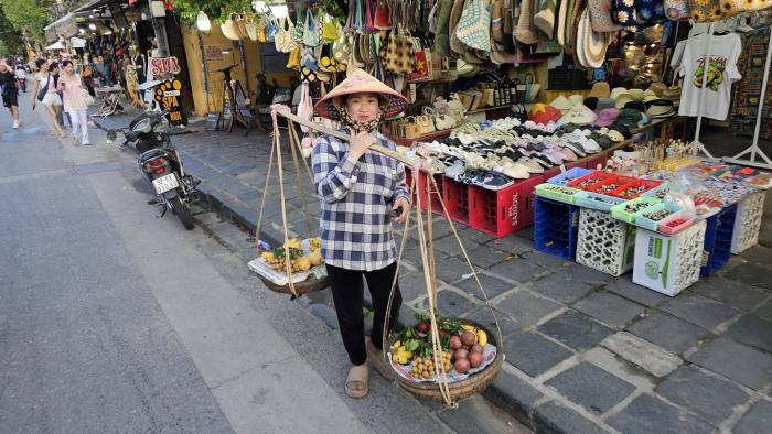 Из курортной полосы современного Дананга, со стеклянными высотками отелей и хаотичным движением мототранспорта на широких проспектах, можно при желании достаточно быстро попасть совсем в другой мир. В мир кривых малоэтажных улочек, украшенных китайскими фонариками и гирляндами цветов, в мир «старорежимного» Вьетнама, где среди разноязыкой толпы ездят рикши и бродят разносчики фруктов в традиционных конических шляпах. Да, вьетнамцы по-прежнему носят тяжести на коромысле — как когда-то у нас в моем далеком детстве. Только вместо привычных в наших краях вёдер с водой, они несут корзины с фруктами.
