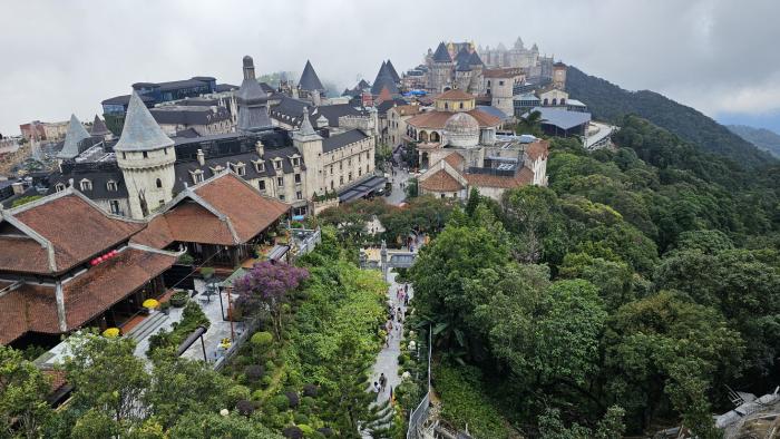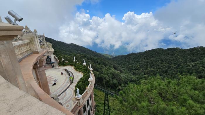 Строго говоря, здесь есть от чего «сойти с ума» — от панорам, которые открываются в Ba Na Hills со смотровых площадок, захватывает дух. Представьте место, где облака встречаются с горами, а волшебные пейзажи переносят в иную реальность. Благодаря высоте почти в 1500 метров над уровнем моря, тут всегда прохладно, и климат напоминает европейский. Утверждают даже, что за одни сутки в Ba Na Hills по очереди сменяются все времена года: утром — весна, днём — лето, вечером — осень и ночью — зима. Разница с температурой на побережье разительная, поэтому имеет смысл брать с собой тёплую одежду.