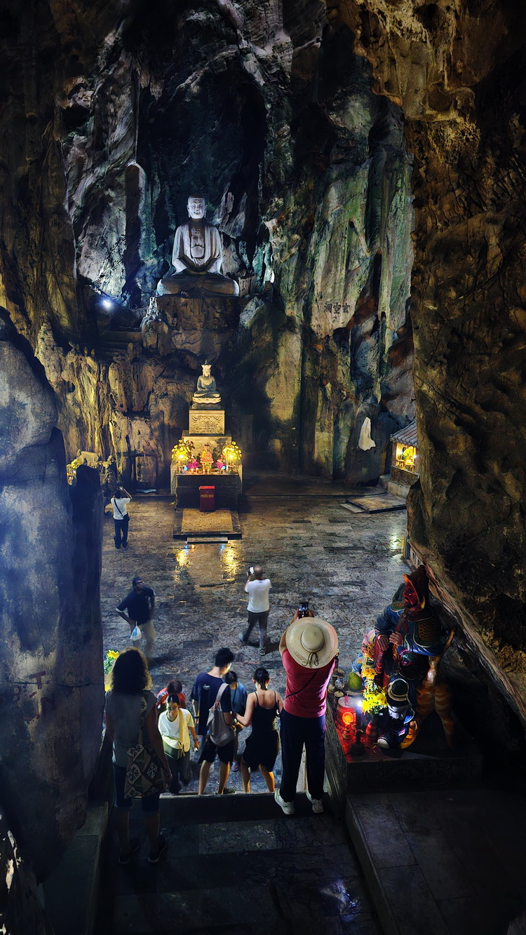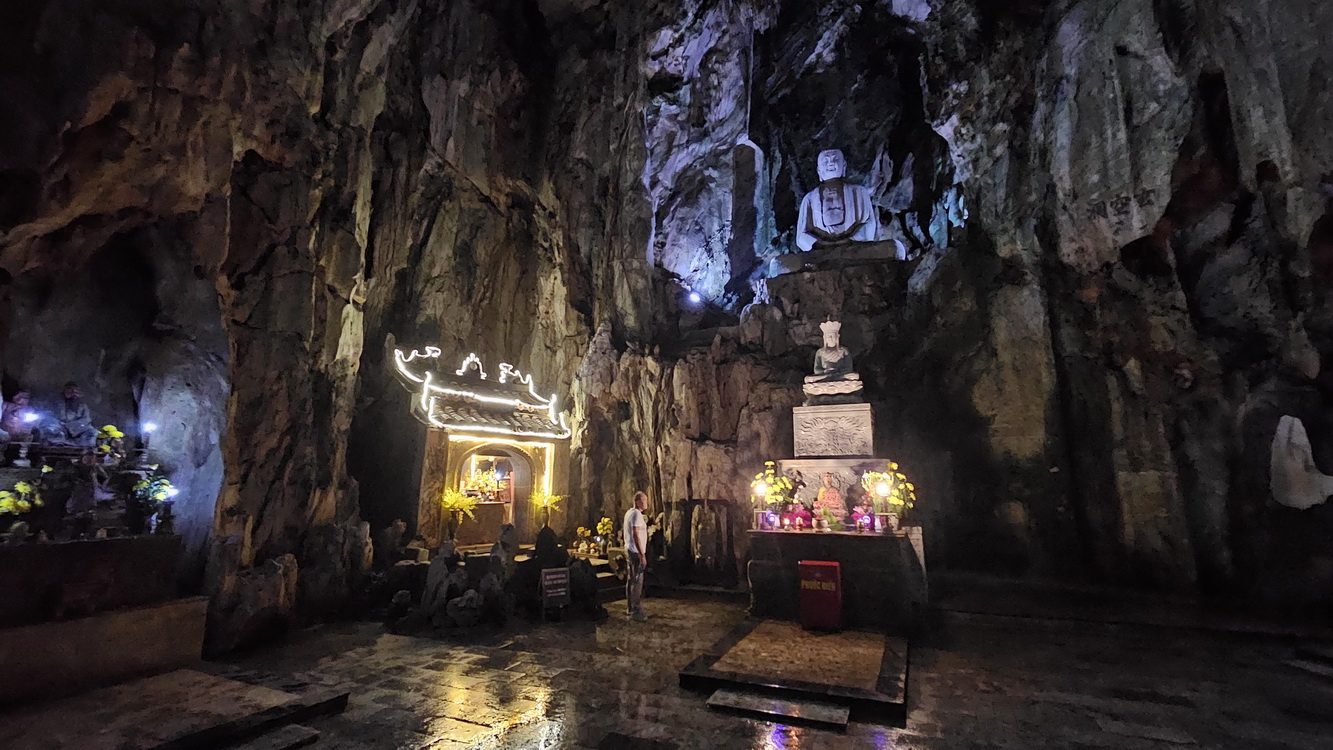 Особенно впечатляет большая пещера Хюэнь Кхонг (Huyen Khong Cave), на входе в которую установлены статуи четырёх стражей, адаптированных, по мнению историков, из индуистских богов. Форма пещеры напоминает огромный перевернутый купол или колокол; ее особенность – сквозные полости на потолке, благодаря которым в храме-пещере всегда есть свежий воздух и естественное освещение. Дневной свет падает сверху на трёхметровую деревянную статую Будды Шакьямуни. Просветленный сидит прямо напротив ступеней, ведущих в храм, и встречает посетителей своей блаженной улыбкой. В пещере царит удивительная мистическая атмосфера, как будто она – не буддистский храм, а портал в потусторонний мир. Кстати, само название Хюэнь Кхонг в переводе с вьетнамского означает «таинственная пустота», что довольно точно отражает духовную атмосферу святилища. Как везде в подобных местах, местные жители подогревают слухи о сверхлюдях и волшебных существах, обитавших здесь в свое время.
