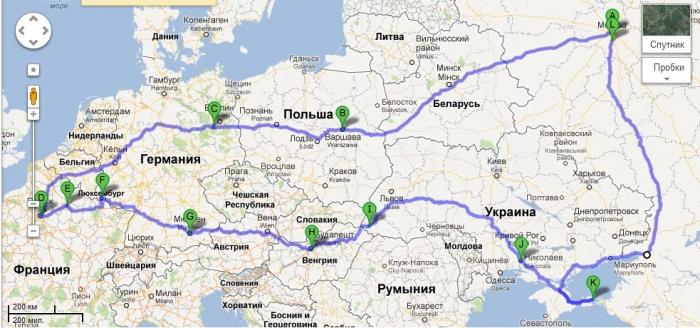Доброго времени суток, решил написать еще один отчетик о небольшой поездочки в сторону моря, теплых стан и европейской цивилизации. Может быть он будет кому-то полезен на будущее, и пригодится для своей поездки, а может просто кто-то скоротает часок свободного времени на работе). В прошлом году я уже гонял в подобное путешествие на тачке в Европу и очень понравилось. На этот раз маршрут вышел по круче, он совмещен с отдыхом на море, это самый оптимальный вариант для путешествия на авто. Поездка планировалась еще за полгода, состав нашей тур-группы и наш транспорт поменялся буквально за месяц до выезда, все что ни происходит, все к лучшему… Собралась офигенно позитивная тур-группа)а мой солярис за всю поезду ни разу нас не подвел, он молодец. Маршрут был проложен через вот такой получился маршрутик, некоторые места наших остановок на нем не отмечены, про них будет написано позже...