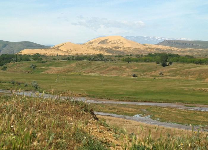 Выезжаю из Махачкалы по трассе «Кавказ» на север, и через двадцать километров, не доезжая моста через речку Шарыозень, слева показывается желтый песчаный массив. Издалека ничего необычного, просто песчаная гряда.