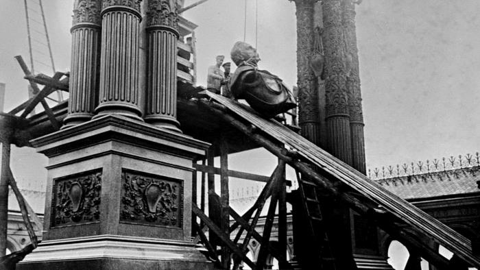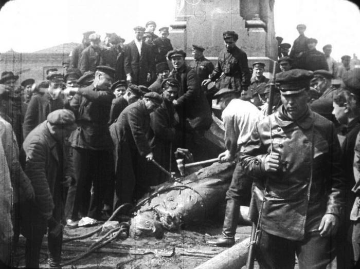 Как раз в 1918 году красная власть стала менять старые памятники на новые. Хорошо известен ленинский план монументальной пропаганды, который был обнародован 12 апреля 1918 года. Документ, в частности, гласил, что «памятники, воздвигнутые в честь царей и их слуг… подлежат снятию с площадей и улиц». Их должны заменить памятники, надписи и эмблемы, отражающие «идеи и чувства революционной трудовой России».