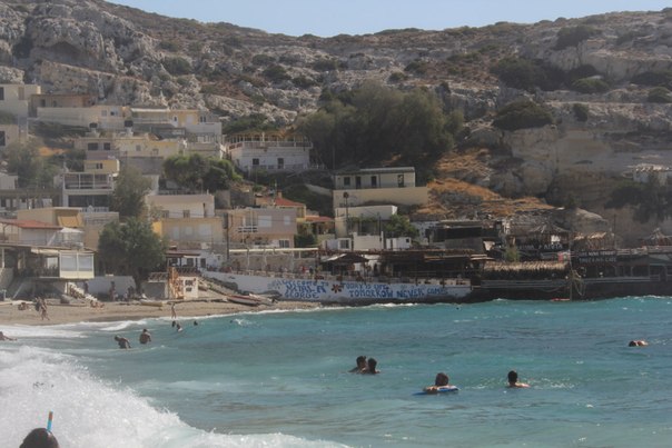 Приезжаем в Маталу – город, который в свое время был очень популярен у хиппи, пока их оттуда не выгнали, но выгнали не всех. На парковке минивен в цветах, в тенечке группа волосатых парней сидят вяжут фенечки и тут же их продают. Пляж большой, заключен в скалы с двух сторон. С одной стороны утес с многоуровневыми пещерами, вход в пещеры платный.