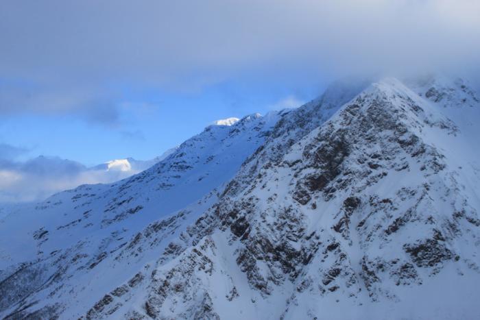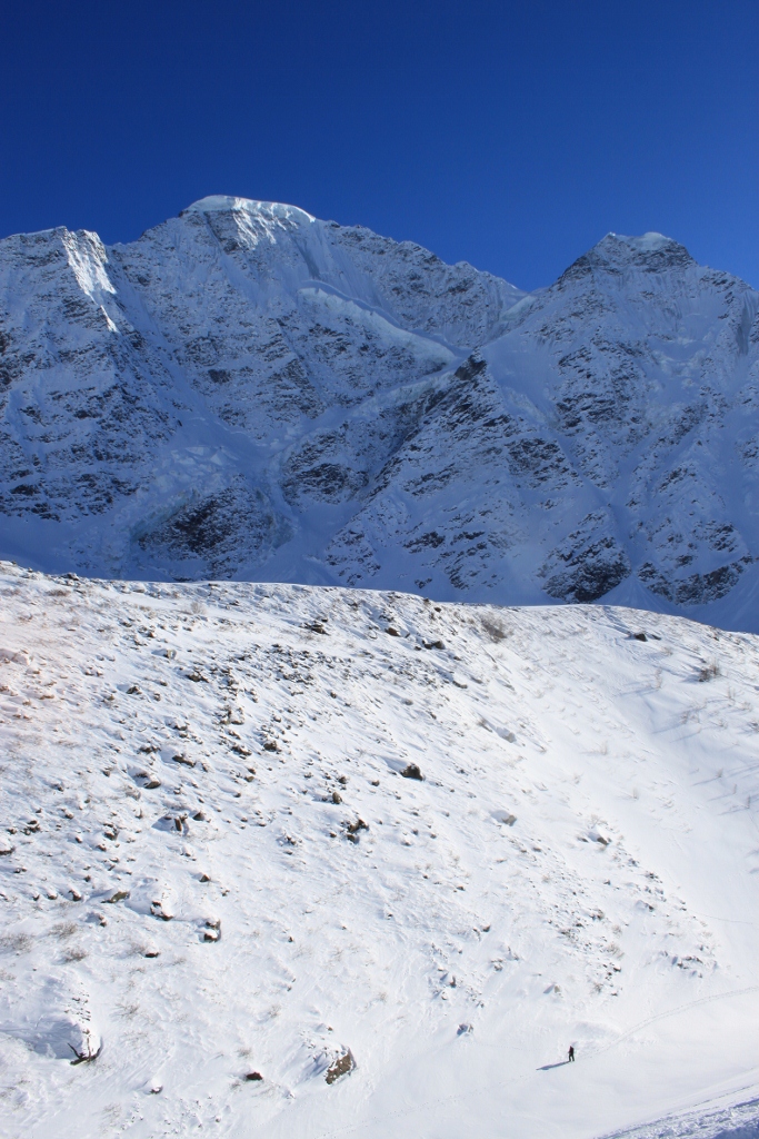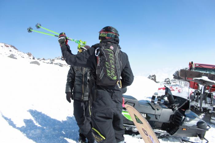 Нам очень повезло с погодой: было много пухляка, на небе ни облачка, лавиноопасность небольшая. Весь день катались фрирайд.