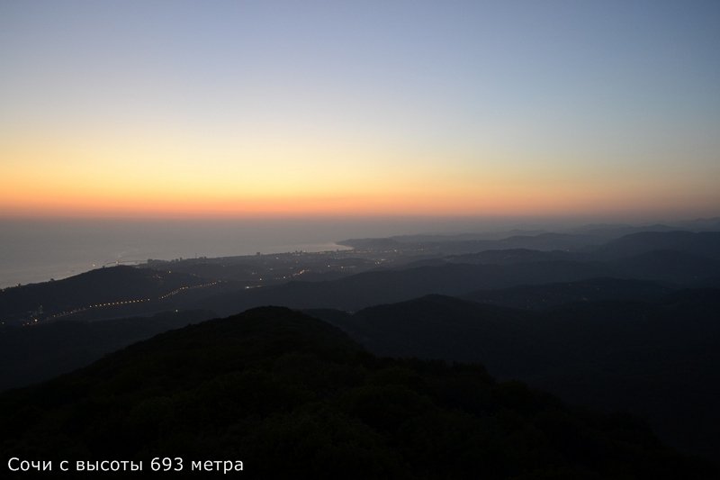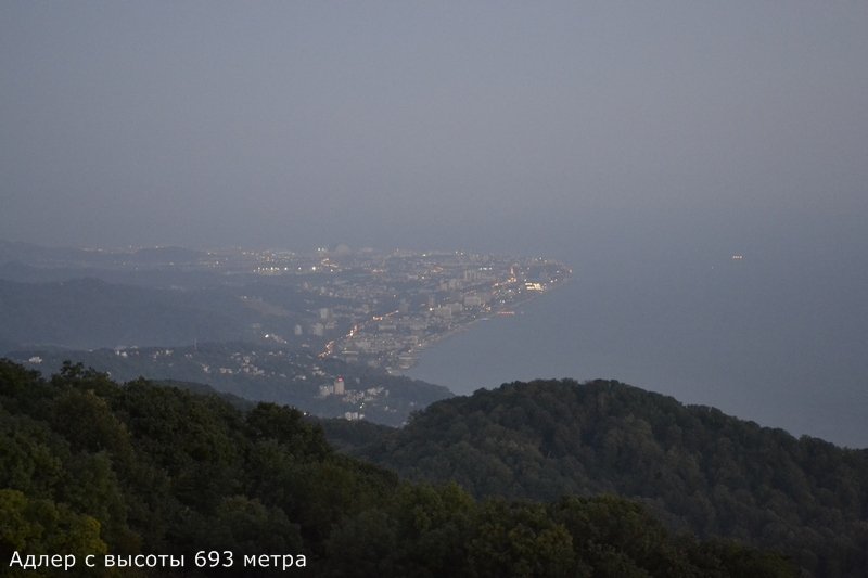 Затем поехали на смотровую башню на горе Ахун, высочайшей вершине побережья. Высота горы 663 метра. Плюс высота башни 30 с половиной. В результате открывается потрясающий вид на побережье. Одновременно виден и Адлер и Сочи. Красота неописуемая.