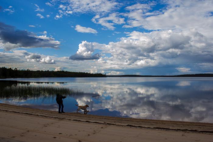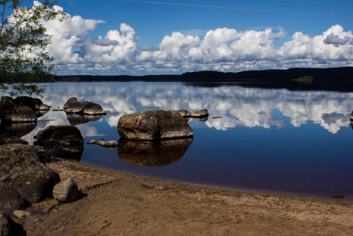 Утром собрались и поехали дальше. Вообще в планах было проехать вдоль Рыбинского водохранилища, Калязин и через Тамбов домой. Но не успели мы отъехать от места ночёвки километров тридцать, как штурман сказала: «А что, действительно до Уксиярви так близко, а у нас ведь есть один день запаса?». Съезжаю на обочину, проверяю по навигатору: до Уксиярви – 430 км. Ну что ж Карелия, мы еще не прощаемся. Через Лодейное поле, Олонец, Питкяранту возвращаемся на озеро. Покатались вокруг озера и выбрали небольшую полянку с песчаным пляжем. На ней и затаборились.