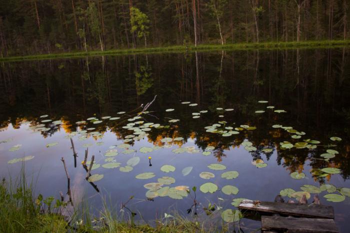Доехали до реки Вуокса, а точнее до Церкви Андрея Первозванного, расположенной на одном из утесов посередь реки. До нынешнего года попасть к ней можно было только на лодке, теперь от берега до острова проложен мост, который принес конечно удобства для посетителей, но лишил место определенной доли загадочности. Да сам мост по своему облику никак не вяжется с местом, больше похож на рабочую галерею из промзоны. На ночевку остановились на небольшом безымянном озере в лесу. Что приятно поразило: судя по очень накатанной дороге, место довольно часто посещают, но вокруг просто идеальная чистота. На полянке, среди сосен сооружен стол со скамейками. Рядом пристроен еще один столик -хозяйственный, под ним, сушилка с посудой, шампура, решетка для барбекю, несколько пятилитровых бутылок для воды. Еще рядом оборудованное кострище и мангал. Берега озера болотистые и для удобства сколочен мосток. И при всем при этом вокруг ни пакетика, ни мусоринки. Вот так-то.