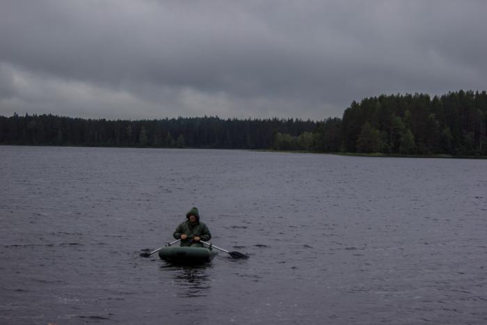 Нам предстоял один из самых трудных участков запланированного маршрута. По этой дороге хотели проехать еще в прошлую поездку, но проходимость ее была под большим вопросом. Навигационные системы выдавали разные результаты: Гугл ее «видел», а Навител нет. Попробовал найти информацию на местных форумах. Один форумчанин мне совершено уверено поведал, что дорога есть, но она для очень «вездеходистых» внедорожников. За дорогой мол никто не следит со времен советской власти, мосты кое где в очень плачевном состоянии, а где и вообще разрушены. Не стали мы тогда рисковать и не поехали по этой дороге. Перед этой поездкой вопрос опять поднялся на поверхность: попробовать или нет. За три года многое могло измениться. К тому же дорога «появилась» на Навителе, что вселяло некий оптимизм. На просторах интернета нашел несколько отчетов (и видео в том числе) за 15 и 16 годы о поездках по этому участку. И мы решили попробовать. В Суоярви залился «под пробку» и в путь. Оказалось, что все не так страшно, как пугали. Нормальная, крепкая гравийка. Встречались широкие, легко проходимые ямы. Если бы ехали в дождь и они были наполнены. то это бы создавало определенные трудности: приходилось бы останавливаться для промеров, а так по причине пустынности дороги их обходишь по любой понравившейся стороне, даже почти не притормаживая. Так легко и непринужденно через Гимолы, Суккозеро, Волому докатились до Муезерского и повернули на Костомукшу. Где-то через 40 км. дорога пошла вдоль довольно большого озера. Оказалось, Боярское и мы решили на нем остановиться. С третьей попытки нашли съезд к очень хорошему месту. Душа не выдержала, накачал лодку и поплыл попробовать рыбацкого счастья. Так как ужин был уже готов, рыбалка была по принципу «поймал-отпустил», но удовольствие от этого получил не меньшее. Как уже дома прочитал, глубина озера достигает 70(!) метров.