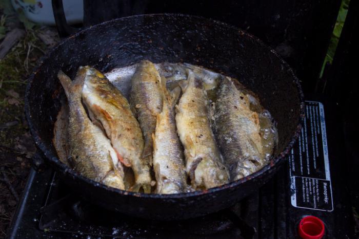 На Онеге задержались на день. С утра погода была пасмурная и ветреная. Озеро хорошо волновалось. Решил, просто на удачу закинуть донку. Закинул и пошел к машине, но только сделал пару шагов, как сзади брякнул колокольчик. Сначала подумал, что это волны тилипают леску, но тут колокольчик запрыгал уже резко и настойчиво. Вытянул леску и обнаружил на другом конце сразу две рыбы. И дело пошло, рыба клевала как сумасшедшая, так что на обед у нас была большая горка жаренной рыбы. Ближе к обеду погода разъяснилась, на озере наступил штиль и клев почти прекратился. После обеда надули лодку и покатались по озеру, а ближе к вечеру еще и поблеснил.