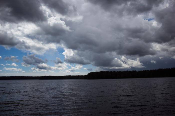 От Залавруги едем к Кивачу. Ближе к Медвежьегорску тучи чудесным образом разорвало, а когда добрались до Кивача то небо практически очистилось.