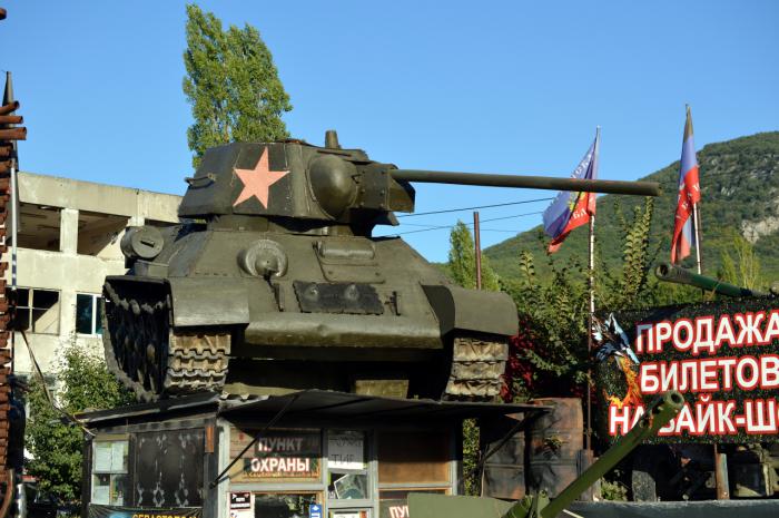 Далее отъехали по шоссе километров 10 в сторону Ялты, там музей у дороги под открытым небом — машины, танки, вертолёт, поделки из металла; на входе копилка — киньте, кто сколько может.