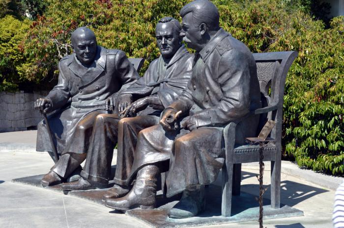 С перевала спустились к Ливадийскому дворцу, полно экскурсионных автобусов, половина из них с детьми-артековцами, в одинаковой форме и одинаково галдящих. Вход 400 руб. с носа, в наш эконом-тур такой ценник не вписался, занялись поиском скульптуры трёх лидеров антигитлеровской коалиции работы Церетели.