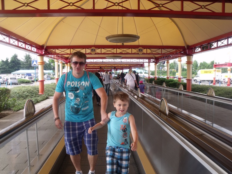 На парковке специально обученные люди распределяют машины во избежание кучек-могучек и прочих непоняток. После того, как мы поставили машину, мы направились к самому парку. К нему ведет горизонтальный эскалатор: удобная штука для многих граждан. Всюду играет зомбирующая музыка из мультиков, которая у меня до сих пор играет в голове, когда я думаю про парк аттракционов =)) Но зато под нее дурачилось все семейство ) На фото это сложно передать, на видео забавнее ))