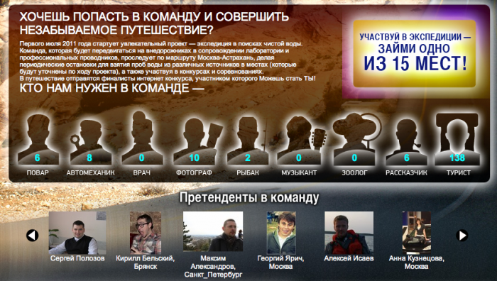 Этим летом экспедиция почти из 30 человек на нескольких внедорожниках отправится в путешествие вдоль Волги. Маршрут от самого её истока до Каспийского моря протяженностью несколько тысяч километров будет пройден за 21 день. За это время команда состоящая из знаменитых блоггеров, победителей конкурса, профессиональных путешественников и просто интересных людей проведет исследование чистоты воды из разных источников, которые окажутся на пути.