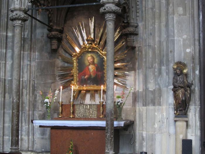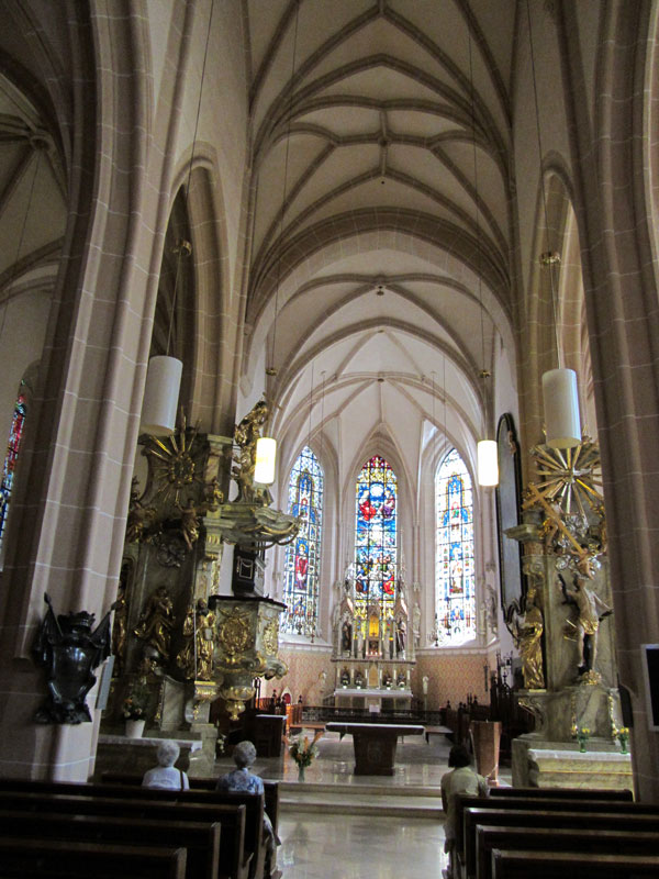 Чем она примечательна? Когда мы в 2008 г. с экскурсией к ней подошли — нас туда не пустили — шла месса. А в церкви висит икона (если ее можно так назвать) — вырезанное на простой доске изображение мадонны с младенцем и листок с сочиненной молитвой под иконой. Эту икону вырезал один прихожанин в 1942 г., года под Сталинградом попал к нам в плен — именно это пленения, как он считал, сохранило ему жизнь. И в плену он сочинил молитву и вырезал на простой доске изображение. После освобождения он привез икону домой в Баден, и ее поместили в одном из углов церкви: