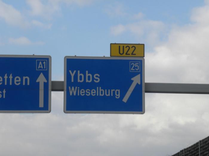 Австрияки, не взирая на ограничение в 130, валили 160-170 и нигде не сбрасывались. Двигаясь в темпе хозяев, мы продвинулись достаточно далеко в глубь этой страны. По пути попался указатель, первая буква в названии города была сразу же заменена на более привычную русскому уху;