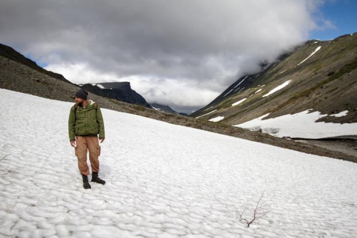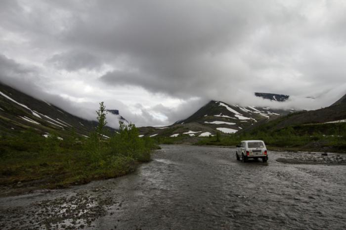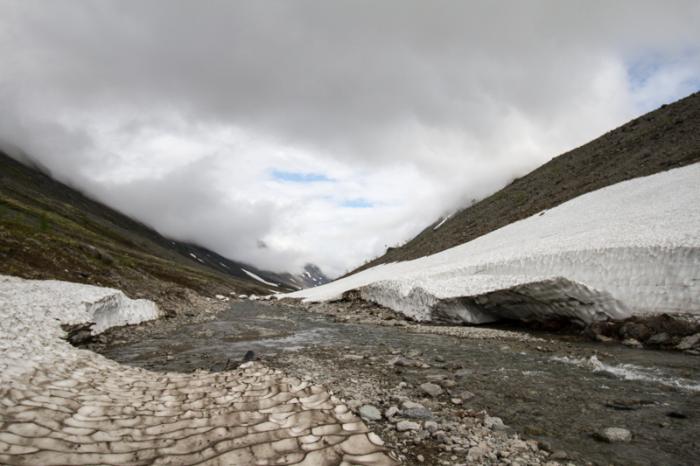 Ну, в реку, так в реку, в режиме полусубмарины поднимаемся всё выше и выше. Воды постепенно становится всё меньше и меньше, а снега всё больше и больше. И слегка не доехав до перевала Кукисвумчорр, под тенью хребта Пачвумчорр, мы упираемся в первый снежный перемет — тяжелый, ноздреватый снег по колено.