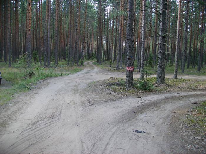 Грунтовка. В дождь туда возможно проехать только на внедорожниках. Дорога уходит в лес и до родника это уже лесная дорога, но настолько накатанная, что заблудиться невозможно. Обязательно будут попадаться такие же болезные пешком, на велосипедах и автомобилях. Свернуть вправо надо у сосны, обмотанной красной лентой.