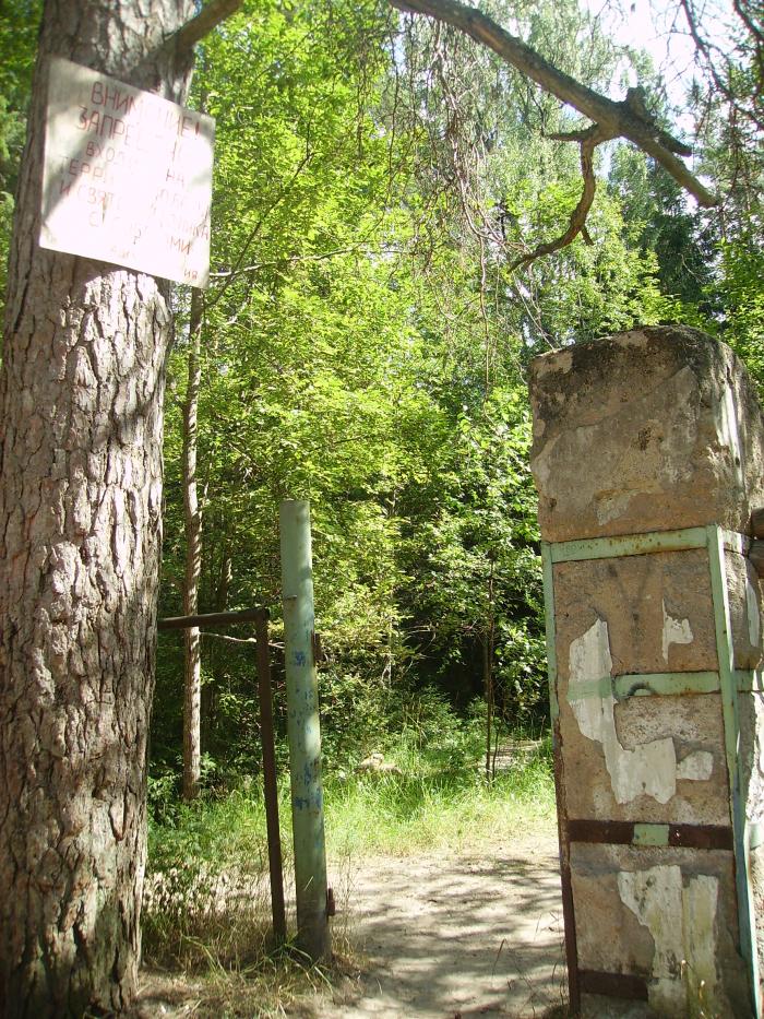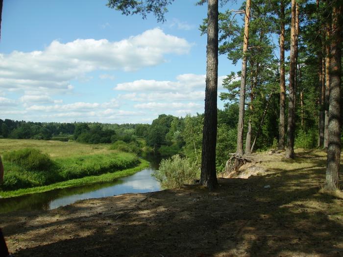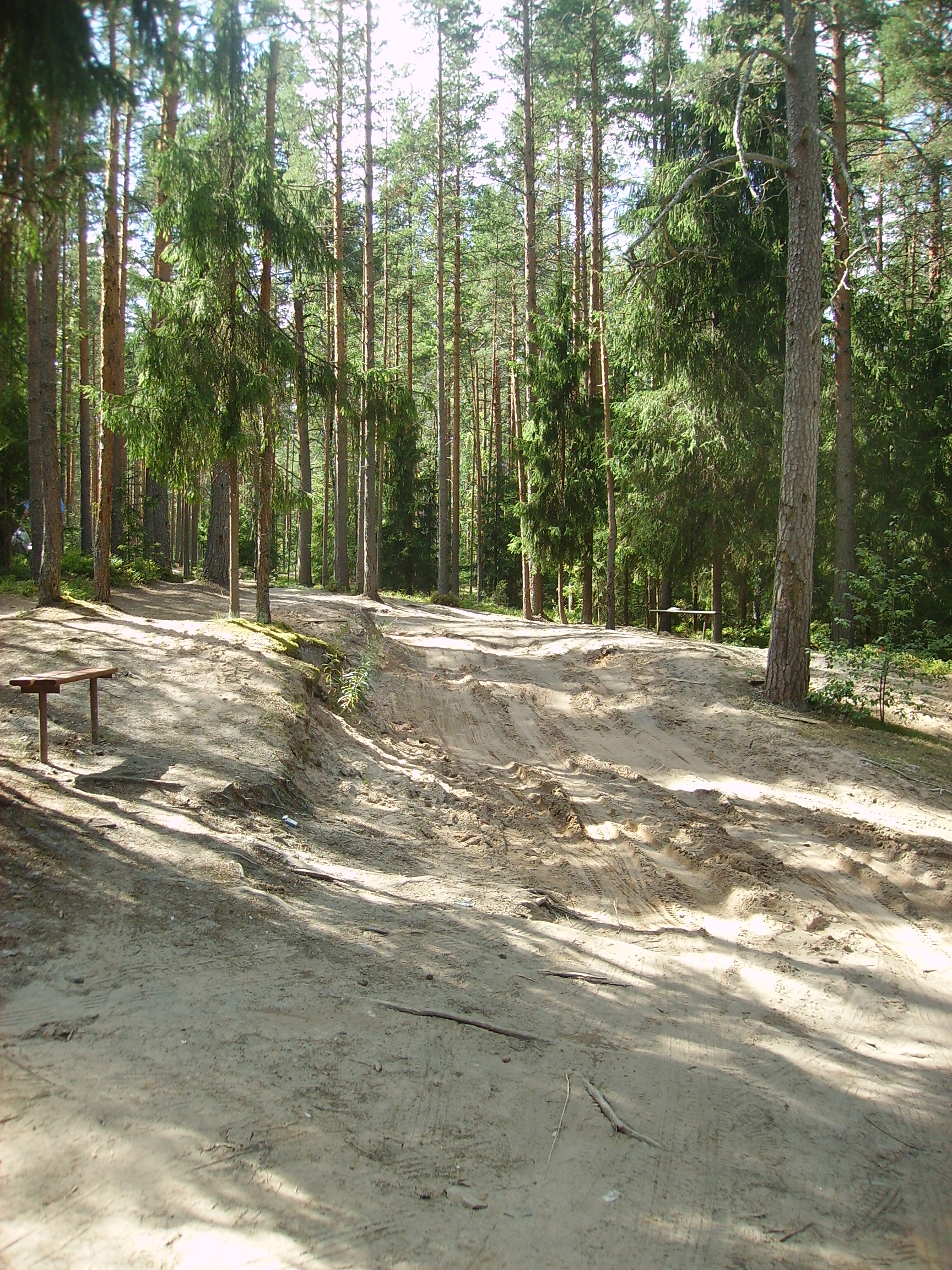 Итак, если ехать с родника до сосны с красной лентой, нужно проехать прямо и метров через 300 будет спуск к речке. Берег обрывистый, но небольшой пляжик все-таки имеется, а также стол, скамьи… в общем место нагуленное, но не достаточно известное.