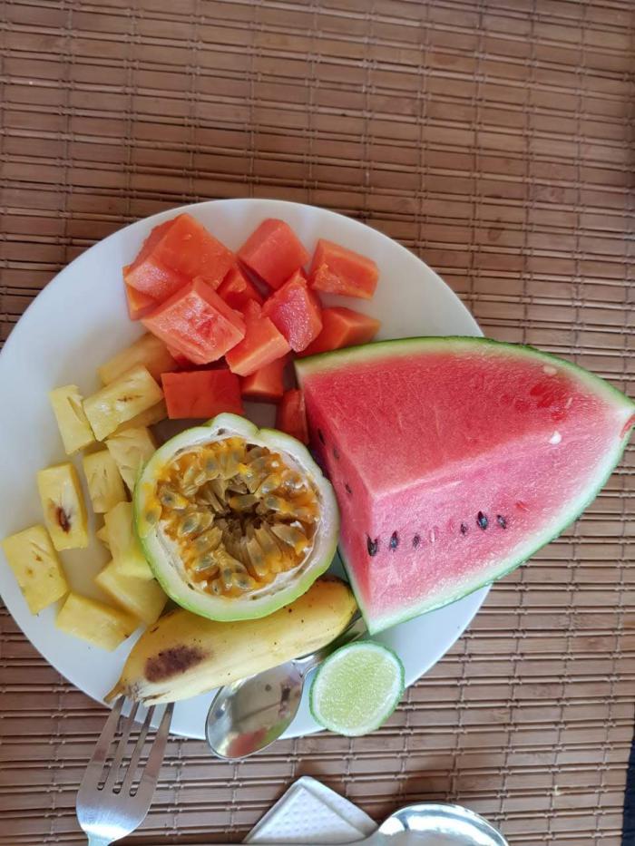 Яркое солнце, играющее на поверхности воды. Небольшая волна и свежий ветерок. Кругом никого. Точно мы в раю! Ну или в рекламе Баунти. Было достаточно рано, а потому не очень жарко и вода оказалось исключительно комфортной. Восторгу не было предела. Восхитительно. В волю накупавшись мы вернулись в апартаменты. На завтрак предложили яичницу или омлет и по большой тарелке фруктов каждому.