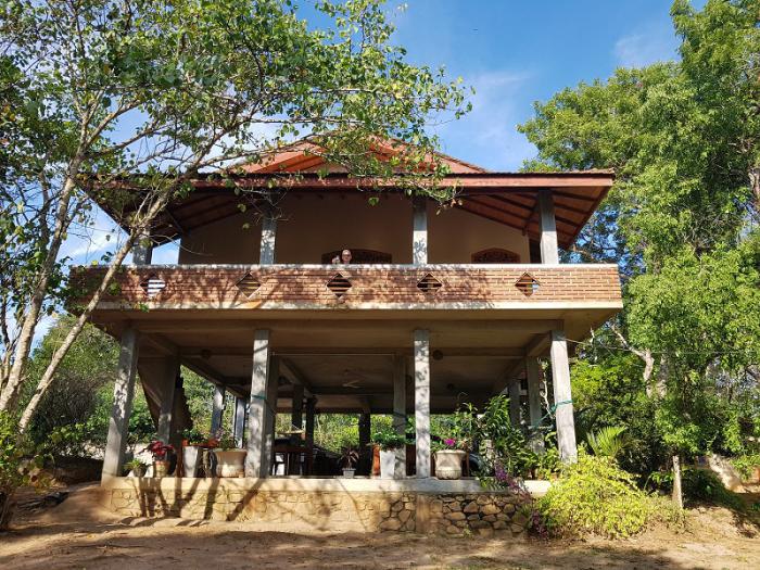 и рабочие в грузовых тук туках или на тракторах, видимо ехавшие с работы. Многие приветливо махали и, конечно, улыбались. Ближе к вечеру мы проехали город Тангалла откуда было уже рукой подать до Tranquality Chalets. Когда мы наконец уперлись в видавшие виды ворота то немного опешили. Букинг, проказник, так расхваливал это место что легко было представить ухоженную территорию с зеленой травкой и отдельными бунгало между пальмами. Что мы себе нафантазировали? Пока мы в недоумении гадали, что делать дальше из-за ограды появилась голова и ворота отворились. Все. Заезжаем, там видно будет. Взорам нашим предстал довольно внушительный серый дом на бетонных сваях