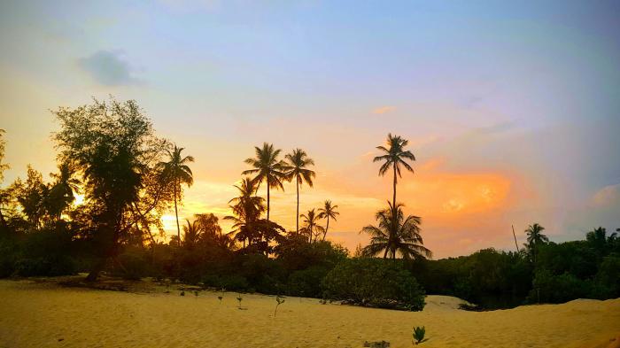 Все изменилось утром, когда взошло солнце. И дом не мрачный, и сад не страшный, и машина в тыкву не превратилась. По пальмам весело бегали бурундуки и заливисто пели птички. Даже имелся павлин, который тоже пробовал подать голос, но лучше бы он молчал. А жизнь то налаживается. Все-таки утро вечера мудренее. Нам не терпелось увидеть океан и поэтому мы не стали дожидаться завтрака, а наскоро собравшись пошли на встречу бризу и шуму прибоя. Открывшаяся картина была идеальной. Вот он необъятный простор Индийского океана!