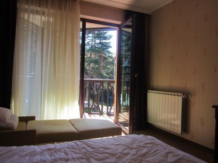 Приехали на место, вышли из машины и… опьянели от потрясающего соснового аромата! Хотелось дышать этим воздухом бесконечно! Рядом с отелем Магнолия заметили еще отель Эдельвейс, но его внешний вид как-то не впечатлил. И вроде бы еще один маленький отельчик есть за деревьями — вот и вся цивилизация. Правда, гостиницы здесь есть еще — они разбросаны по лесу на расстоянии друг от друга в 500-1000 метров, так что создается впечатление уединённости. Магазина здесь нет, так что всё необходимое нужно покупать в Сапаревой Бане. Зато здесь же есть ресторан, хозяин которого не пользуется удаленностью места от супермаркетов — цены здесь примерно такие же, как и везде, где нам приходилось трапезничать.