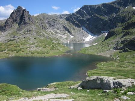 Напившись вкуснейшей горной воды, пошли по нижней тропе. Народу здесь встречалось мало. Но опять-таки заблудиться невозможно — на камнях ясно прорисованы знаки туристического маршрута. Совсем скоро мы вышли к четвертому озеру — Близнака (Близнец), самому большому по площади из всех семи Рильских озер.