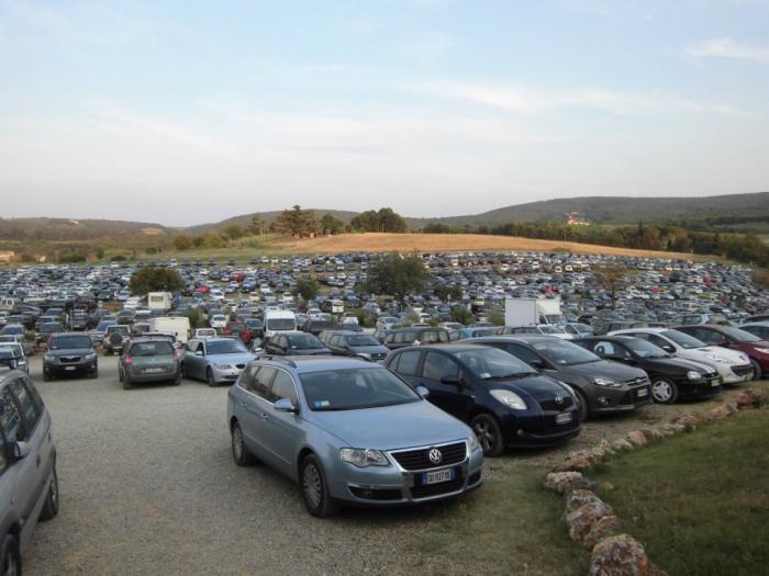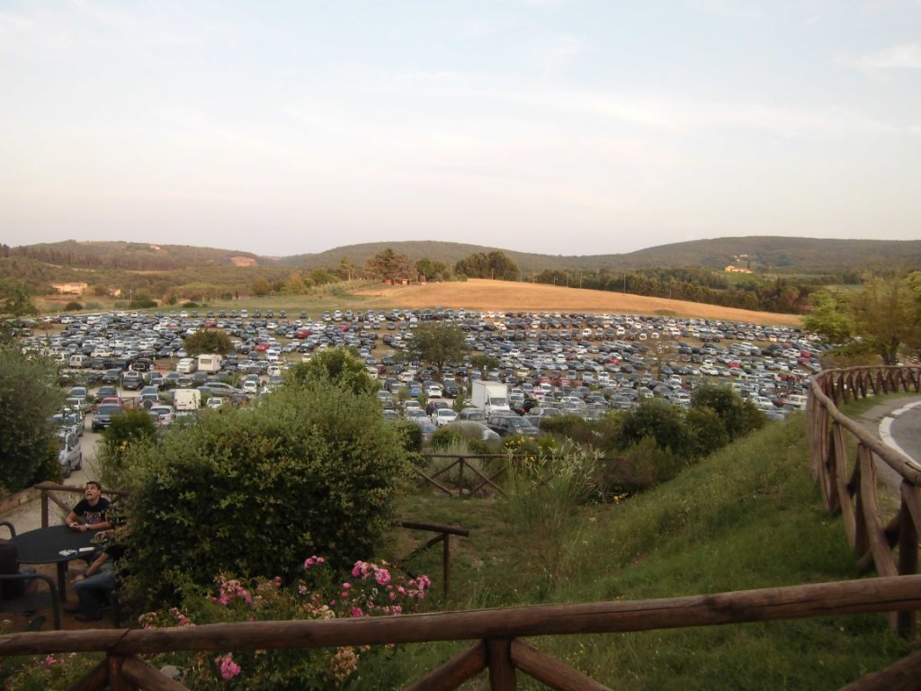 Итак, представьте себе…тосканские холмы… сплошь заставленные машинами! (на фото — начальная стадия парковки, ещё не стемнело:)))