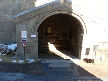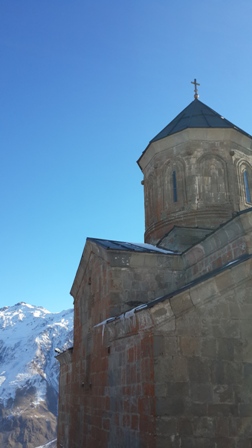 На улице лето, открыли окна, наслаждаемся…. Первая наша точка Троицкая церковь в Гергети (Гергетская самеба), расположенная на высоте 2170 м. прямо над поселком Степанцминда. Добраться до заданной вершины не просто! Проехали поселок по накатанной дорожке, но подбираясь все ближе и ближе к горе, становилось все больше и больше снега. Дорога к церкви поднимается в гору серпантином и состоит из одной калии. Два автомобиля так просто не разъедутся. Лишь на поворотах или тех местах, где становилось чуть шире, один автомобиль старался как можно больше заехать одним бочком на склон, а второй в этот момент аккуратно крался мимо! Не создавая лишних потоков воздуха и не дыша в сторону «встречки». Вот так и мы взбирались на гору. Сначала громко-громко дудели клаксоном, потому как наш Паджеро не маленький, а только потом аккуратно трогались с места и проезжали дальше. Уже на самой вершине мы чуточку закопались, но все обошлось и добрались до намеченной точки следования.
