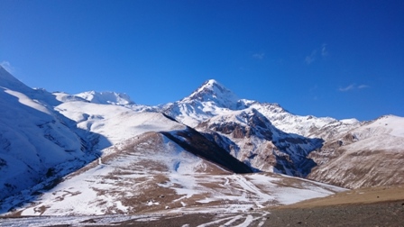 Красота этого места завораживает. В ослепительных лучах солнца мы увидели не только церковь, но и полностью гору Казбек.