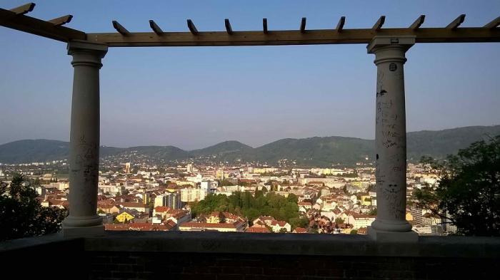 Побродив по старому центру, решили взобраться на гору Шлоссберг. Девочки, конечно, пешком по лестнице, а мальчики с нашими сумками — на лифте (говорят, было очень страшно..).