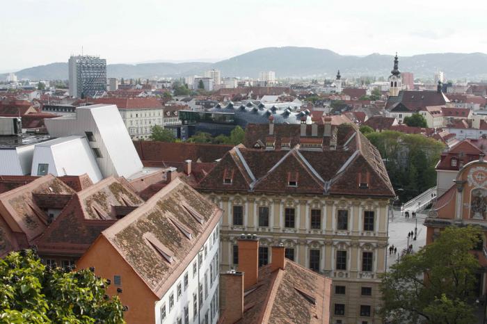 В панораме красночерепичного города, открывающейся с холма Шлоссберг, взгляд цепляется за инопланетное чудовище – Кунстхаус, выставочный зал.