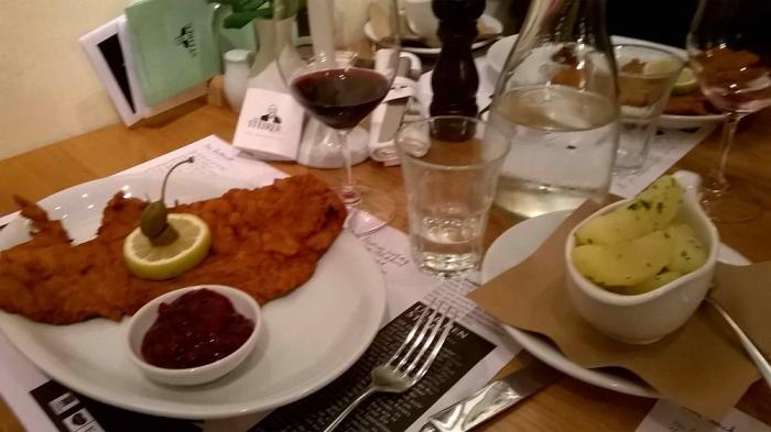 Заселились мы в отель Ибис — самый плохонький из всех в поездке, зато самый дешевый. Решили заполнить сэкономленное в бюджете хорошим обедом и съесть, наконец, венский шницель в рекомендованном, опять мишленом, ресторане. Подают этот тонко отбитый кусок нежной говядины, обжаренной в сухарях, с холодной картошкой, приправленной кислым луком. Шницель проверку прошел, а вот знаменитый штрудель не всем понравился из-за корицы в яблоках…