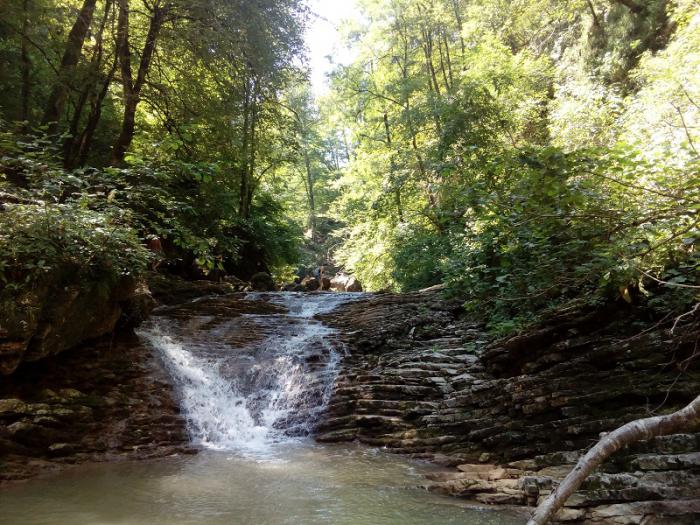 День 4. Наряду с горами, одна из самых главных красот предкавказья — это его водопады. Поэтому мы отправились к самым красивым из всех тех водопадов, информацию о которых нашли в интернете, — к водопадам «Руфабго». Вход в комплекс платный: 150 руб с человека, но за эти деньги вы получаете легкий доступ к осмотру каскада из 7 водопадов. На протяжении всего маршрута вас ведёт вперёд протоптанная тропинка, а в местах резких спусков и подъёмов сделаны удобные лестницы, так, что даже самому не подготовленному туристу эта полуторакилометровая прогулка покажется не сложной. Основным же достоинством этого комплекса является то, что придерживаться проложенной дорожки совершенно не обязательно, и можно смело скакать с камня на камень в поисках подходящего ракурса для фото.