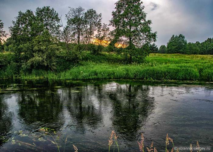 Облака переливаются загадочным светом. Полный штиль на реке.