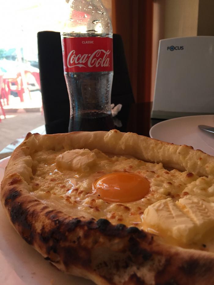 Наш первый грузинский завтрак, плавно перетекающий в ужин состоялся в придорожном кафе. Голодные глаза заказали столько еды, которую еще нужно было умножить на два из-за размера порций. Она оказалась настолько вкусной, что без проблем ее съели. Но взяли на заметку, заказывать половину порций, если такое существует в Грузии =)