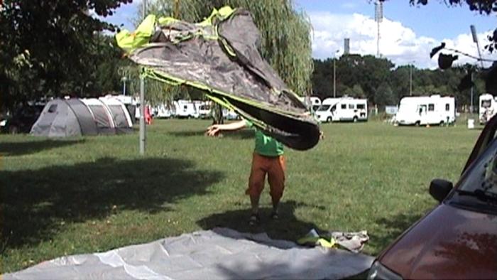 Вечер кончен и настала пора новоселья. Первая ночь в палатке. Для комфортного сна ещё днём надули двуспальный матрас и приготовили байковое одеяло. Надували матрас обычным толстым ручным насосом. Сосед – то ли немец, то ли поляк – предложил для этого электрический насос, штуцер не подходил к шлангу, но сосед усердно помогал не жалея штуцера. Всё обошлось, мы отблагодарили их московскими конфетами. В другом конце стадиона ухала дискотека, а дневное тепло сменялось ночной прохладой. Когда надуваешь матрас на пляже, стряхивая прилипший песок, нужно быть осторожным чтобы не обжечься о глянцевую поверхность баллона. В романтической прохладе ночи характеристика матраса предательски меняется на противоположную. Ливерный отдел тяготеет к сырой земле, добывая холод для всего тела. Байковое одеяло, в обычных условиях согревающее двоих, не укрывает боков и ограничивает подвижность с тревогой разбудить соплеменника. Сон не приходил, холод пронизывал до дрожи, лезли тревожные мысли про здоровье и предстоящую дорогу без отдыха. Холод балансировал на грани принятия решения о перемещении в автомобиль. Наутро чужой опыт использования спальных мешков не вызывал и тени сомнения. Руководствуясь знаниями в области теплотехники и термодинамики, я решил приобрести ещё и туристические коврики с фольговым покрытием, чтобы укладывать их поверх матраса. Надувной матрас идеально выравнивает рельеф местности и облегает фигуру, но не более того. Радует отсутствие комаров, видимо такие климатические условия не для них. Раскатистый грохот утреннего трамвая возвестил об окончании боевого крещения первой ночёвкой на природе.