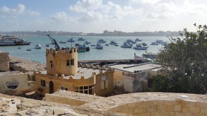 Значительная часть древней Александрии сегодня лежит на дне гавани, западный конец которой упирается в мыс, где некогда стоял Александрийский (Фаросский) маяк. Маяк рухнул во время сильнейшего цунами в 365 году нашей эры и в наши дни здесь находится форт Кайт-Бей уже XV века, откуда открывается прекрасный вид на город. При строительстве форта были использованы остатки древнего маяка.