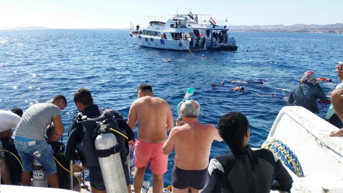 Тут отличное место для подводного плавания. Чистая и тёплая вода, богатый подводный мир и большое количество коралловых рифов создают великолепные условия для занятия дайвингом и снорклингом (это вид плавания под поверхностью воды с маской, дыхательной трубкой и с ластами) — как зимой, так и летом. В городе и в окрестностях имеются многочисленные дайвинг-клубы, школы подводного плавания, яхты, инструкторы, а также пункты проката масок, ласт, аквалангов. Единственное, что следует иметь в виду: практически по всему побережью Шарм-эль-Шейха, за исключением некоторых пляжей, необходимо входить в воду в специальной обуви. Так как у берега начинаются острые коралловые рифы, на которых к тому же много морских ежей. Вообще-то сам я заходил в воду в резиновых шлепках, которые привез с собой из Казахстана. В них удобно в номере отеля и двигаться по городу. И, как выяснилось, вполне можно плавать и даже наступать при необходимости на прибрежные кораллы. Но другим этот опыт повторять не советую. Я на воде держусь уверенно, нештатные ситуации меня не особо напрягают. Тем не менее, пока не приобрел некоторый навык, выходило несколько неуклюже. То один, то другой шлепанец срывался с ног, и приходилось «ловить тапки» в море.